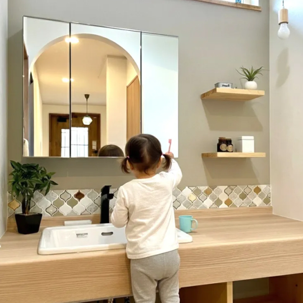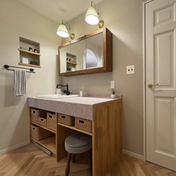 写真の洗面台はお客様のために造作した、オリジナルの洗面台。造作大好きなスタッフが、お客様のために世界に1つの家具を造作することだってできます。