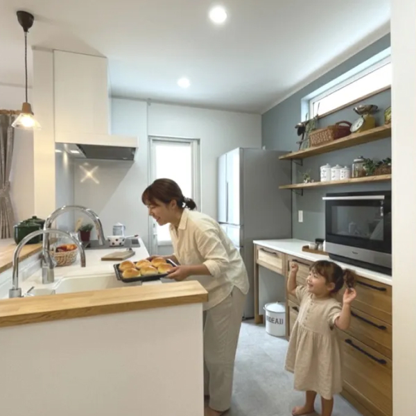 キッチンはママの憧れを実現。包丁のトントンという音、鍋のグツグツという音と共に、まるで映画の一コマのようにお料理するママの姿が見えるようです。